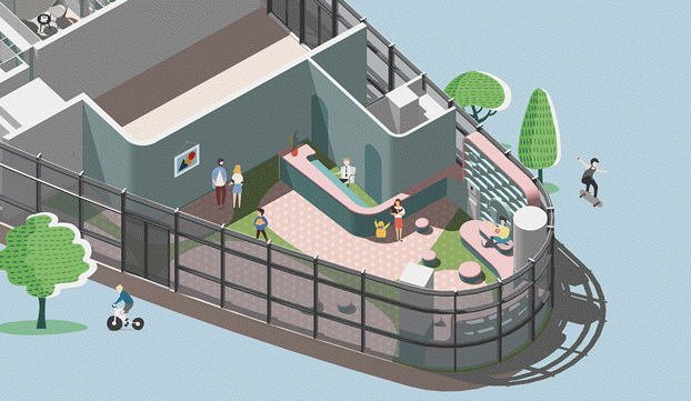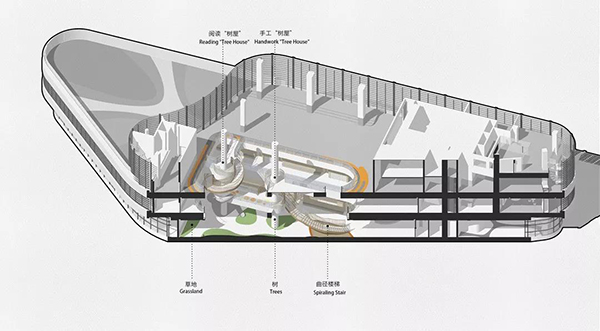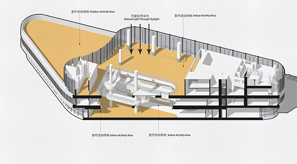 三層成為室內外結合的大活動場地,跑道從中庭衍生出來,利用連續自然的曲線劃分出不同主題活動區域,并通過塑膠跑道串聯起所有室內外活動。