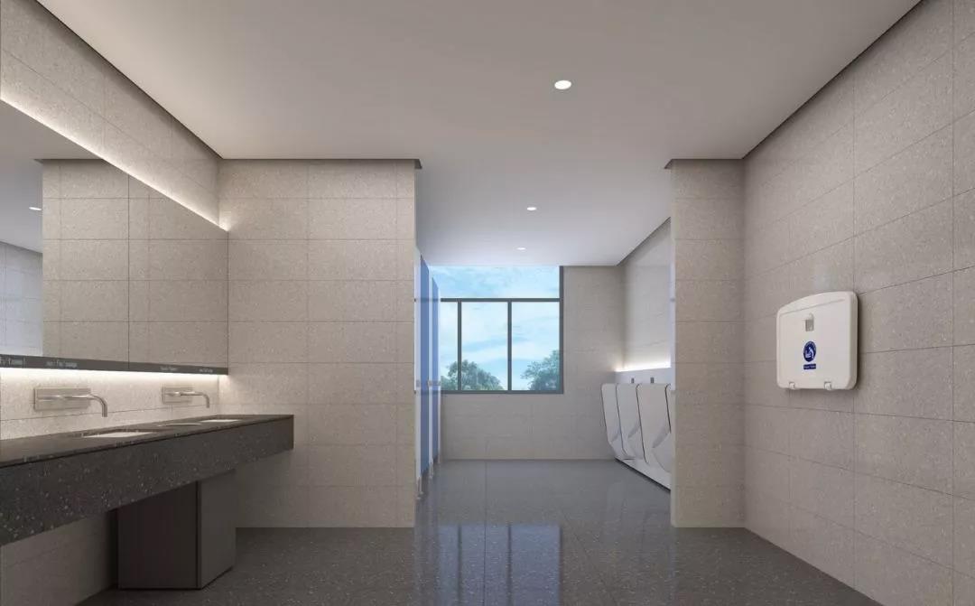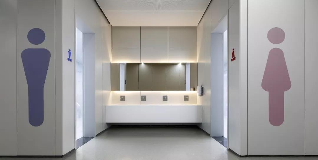 在運行維護方面,金屬墻面、橡膠地面、穿孔鋁板吊頂的保潔非常方便。特別是金屬墻板、鋁板吊頂都是工業化生產的成品,不同批次的產品達到了高度標準化和一致性,更換時不必擔心色差的問題。而且墻面、吊頂的安裝均采用集成工法,安裝和更換操作簡單便捷。圓弧形邊界的設計,不但利于保護人員安全,而且便于保潔人員清理。地板與墻面、樓梯與墻面的交界處均設有凹槽,為清潔操作提供方便。衛生間的洗手盆、馬桶沒有顯露在外的排水管,避免了排水管與地面交界處的粘合膠帶來的美觀性問題,而且便于清潔。