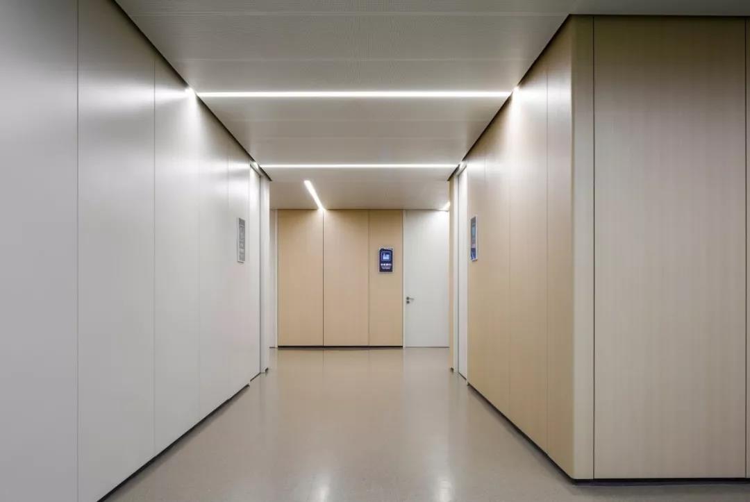 在保證工期方面,采用了孫亞明研究多年并積極踐行的集成工法。系統集成裝飾工法是將各種裝飾面板材料在工廠區加工完成,通過專用連接件干掛在空間載體上。以鋼質護墻板為例,在工廠利用大型機器,將熱熔鍍鋅鋼板壓制成型,表面做抗菌靜電粉末噴涂油漆,環保、抗污、耐摩擦。背襯采用加強鋼制瓦楞,耐撞擊。在原始毛坯墻面直接固定自主研制的C型專用輕鋼龍骨,成型板材只需輕輕一拍,即可固定于墻面。系統集成裝飾工法具有施工便捷、節約造價、縮短工期、環保無污染等優點。吊頂則采用設備集成帶,把所有空調的風口、消防的煙感、網絡的路由及其他管線、燈槽都集成在里面,安裝時在吊頂內預先留出空間,成品安裝,操作方便,便于檢修。裝飾材料損耗在工程造價中占據很大比重,而系統集成的最大優點在于,將材料套材化、模塊化。在室內建筑裝飾設計中,為了實現工業化大規模生產,使不同材料、不同形式和不同制造方法的建筑構配件、組合件具有一定的通用性和互換性,統一選定協調建筑尺度的增值單位,即為建筑模數。以基本模數倍數來分割材料尺寸,這樣可以最大限度地使用材料,把損耗降到最低。在環保方面,整個項目的裝飾材料中均不含甲醛,施工完成后可以立即投入使用,其他材料和家具、裝飾品的選用也都考慮了環保性。穿孔鋁板吊頂可以吸音,橡膠地板可以降低行走時的噪聲,這些都有利于營造健康的環境。高端病房的定位對標五星級酒店,采用高聚合板,而不再是普通的乳膠漆墻面、很硬的瓷磚或木飾面。該材料不含甲醛、防水、防火、防沖擊、防霉,效果相當于硬包,其表層是醫用的墻布,也可以仿皮革、仿布紋,能夠提高醫院的舒適度,而且施工簡單。
