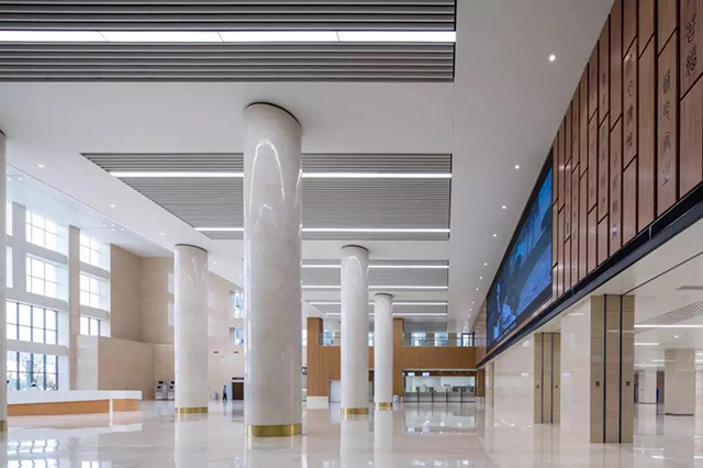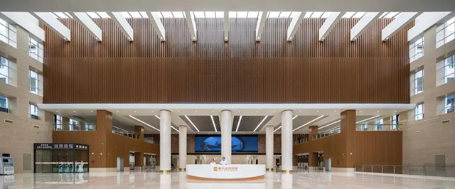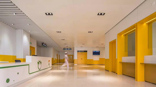 在空間的色彩規劃方面,除了兒科、婦科等特殊科室采用迎合兒童心理活潑的色彩和迎合女性心理的柔美色彩搭配之外,空間的主體色彩為暖色調,給人以舒適感,營造出友好的空間氛圍。干凈整潔的空間感受,打破傳統醫院的冰冷感,采用穩重的木色金屬板與米色的大理石搭配,滿足院方對于該項目穩重、大氣而又具有親和力的空間氣質定位。局部墻面采用洞石,典雅的紋理、自然的氣質,凸顯出空間的品質。