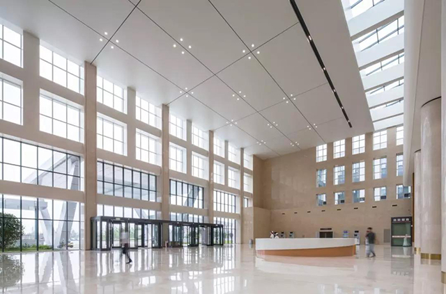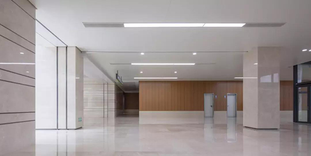 項目中所體現的建筑室內一體化設計理念,還表現在技術層面的把控上,即處理好室內設計與建筑、景觀、結構、幕墻、機電等個專業復雜的協調關系。在滿足規范的前提下,設計團隊對防火卷簾、消火栓、擋煙垂壁等消防設施的位置進行了相應的調整,改變了建筑空間序列的銜接遞進關系。重新梳理了室內房間隔墻與幕墻的關系,盡量避免了室內隔墻與玻璃幕墻的沖突,很好的處理了吊頂窗簾盒與幕墻的關系,地面地臺、窗臺與幕墻的關系等。解決了建筑變形縫與室內設計、幕墻的關系,始終把建筑構造邏輯放到室內設計之前,強調功能美學、技術美學。