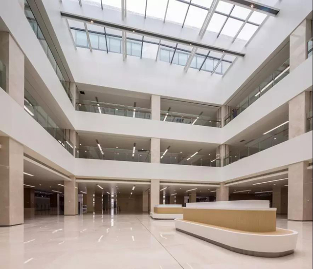 為了豐富空間體塊銜接的豐富性和光影的變化層次,在門診大廳頂部增加條形采光井,有了天光,空間變得更加靈動。天光傾瀉而下,賦予空間無與倫比的表現力,同時三層、四層的房間得到了充足的采光,功能與藝術達到高度結合。