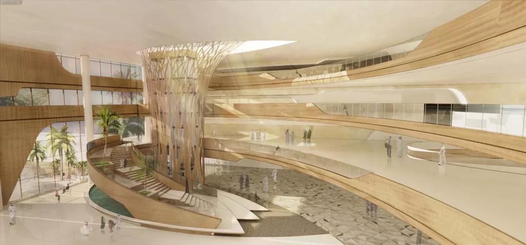 設計方案還將收集寶貴的雨水作為中水再利用,在寬廣的屋頂上設置太陽能板以充分利用當地充足的陽光,提供該建筑群所需的部分能源。為了保持建筑內部的涼爽,方案融合了地熱系統、高效的外部圍護結構和玻璃窗的作用,最大限度地減少室內的熱量,降低室內溫度。公共和工作人員的流線被布置在建筑之間的庭院,商業和自助餐廳也沿庭院布置,并設置遮陽裝置以防止沙漠熱浪的侵襲。