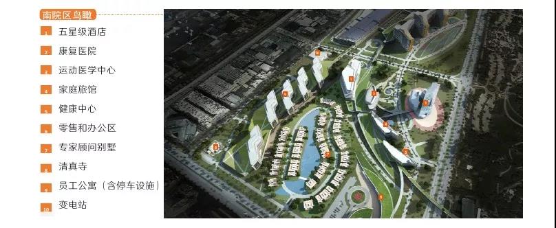 南側地塊將被創建為一個康復商務園區,包括一個設有320個床位的康復醫院、一個運動醫 學中心、一個含250間客房的五星級酒店、一個家庭旅館和一個商業市場。商務園區還包括六座醫院員工公寓樓、多棟專家顧問別墅以及一個含2400個停車位的停車場。