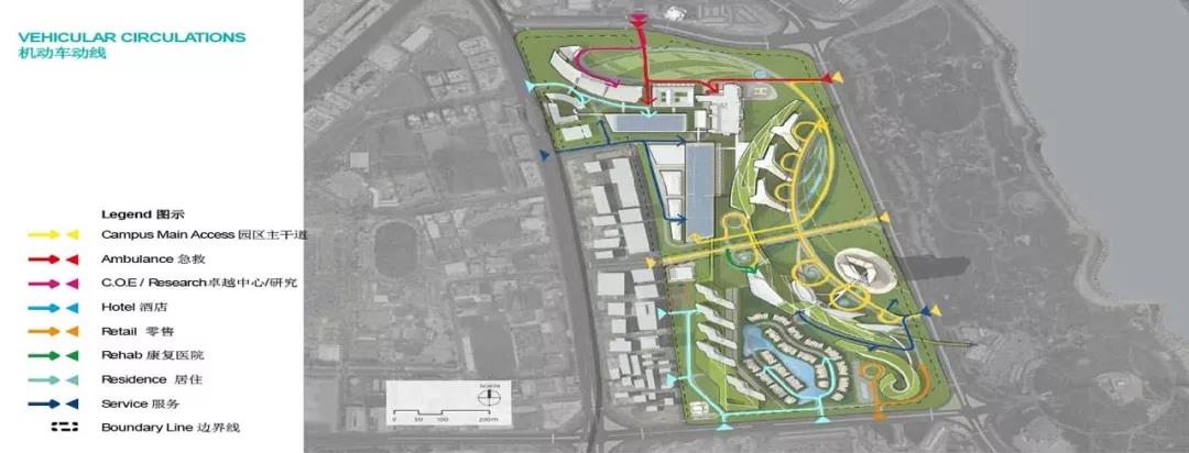 迪拜拉希德國際醫學城規劃方案解決了醫院建筑及其周圍醫療設施所面臨的后勤問題,考慮了沙漠氣候中建筑的可持續運營,并體現了迪拜諸多標志性建筑所營造的城市特征。