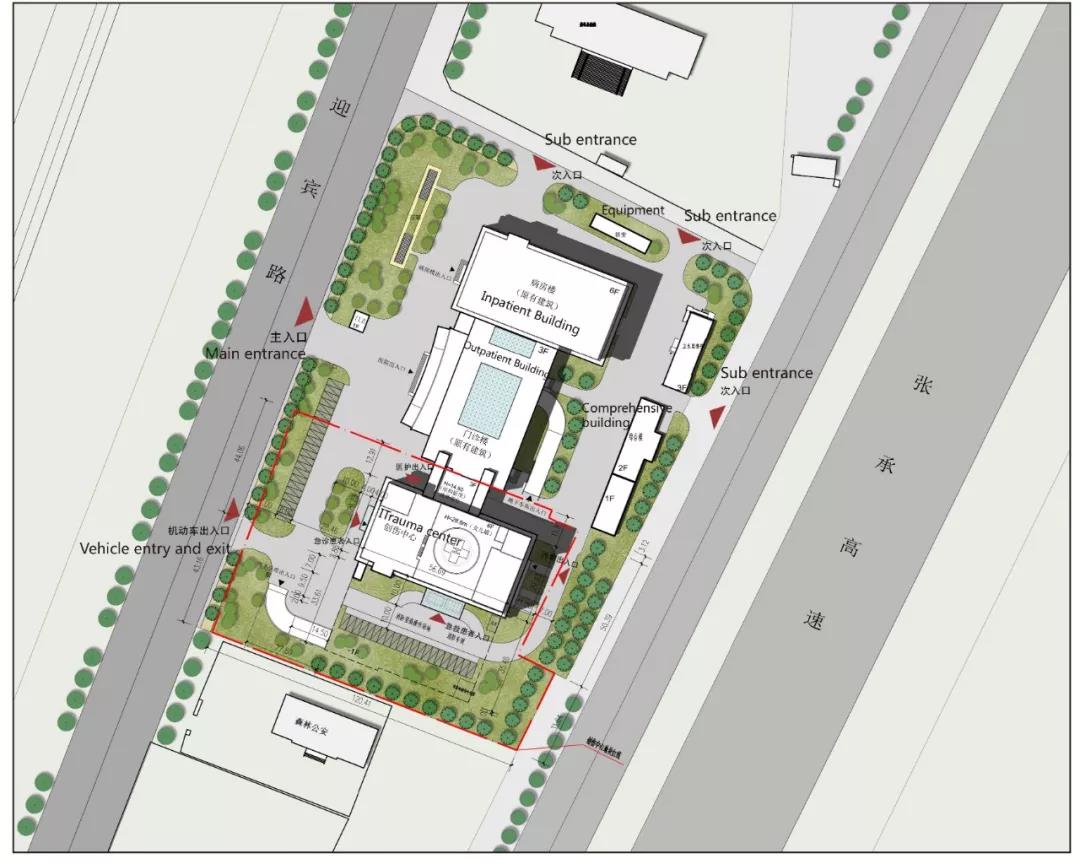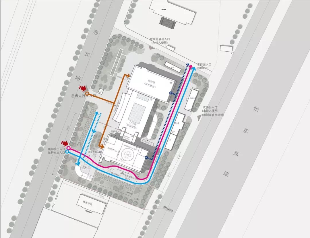在該項(xiàng)目的交通規(guī)劃中,我們把原院區(qū)的主入口改為人流主入口,并在場(chǎng)地西南方向設(shè)置了一個(gè)車行入口,一方面是緩解主入口人車混行的交通壓力,另一方面是方便急救車通行。通過(guò)合理的交通組織設(shè)計(jì),旨在實(shí)現(xiàn)人流、物流、車流等交通流線清晰明確、易于識(shí)別,減少擁堵和迂回。