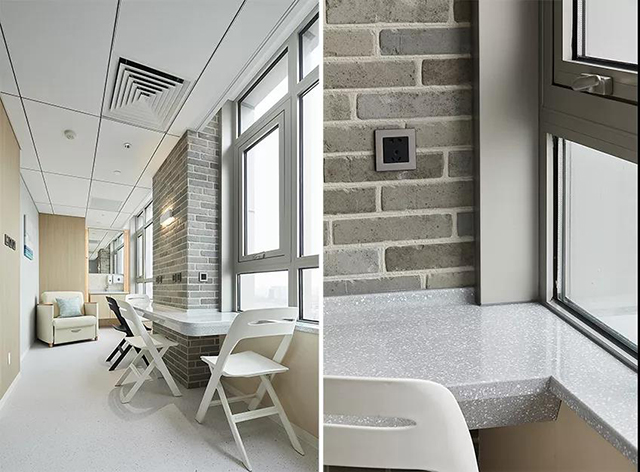 兩個三人間病房共用一個采光陽臺和洗手間,同時把家屬與患者休息區域分隔開,家屬間的交談區域成為緩解釋放壓力的空間,明亮,親切,舒適,美好。
