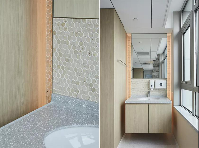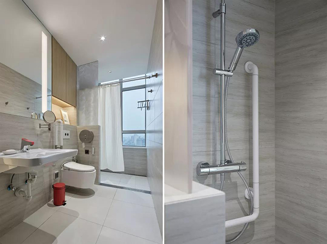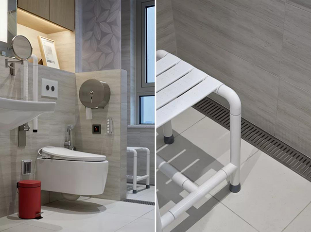 衛生間是患者便捷體驗及安全性保障的重要區域,比如一個小小的紅色水龍頭的設置是考慮適用于兒童、老人、殘疾人的使用特點,感應式啟停,節水節電。鮮明的色彩適合殘障人士、視障人士及幼童使用的顏色,并設有特別訂制的保護套和最高溫度限制以防燙傷的安全保護措施。患者在衛生間內的站,坐,行的每一處細節都有專注與愛的支持。