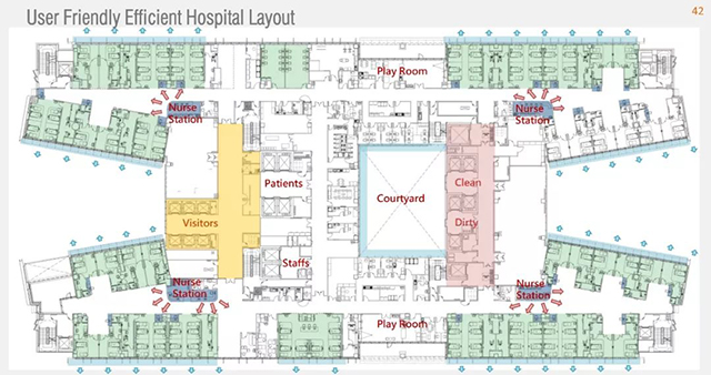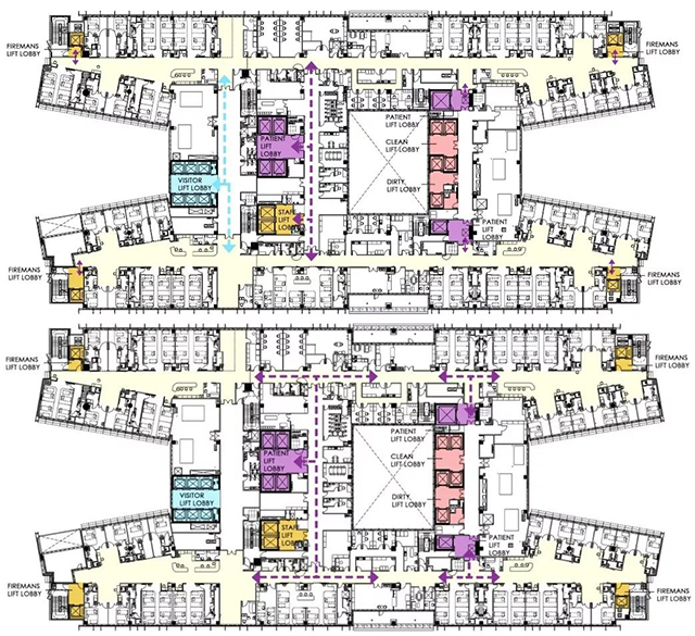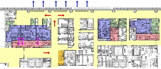 此外,接受治療的住院患者以及門診患者的交通流向會嚴格區(qū)分開,最低限度的減少門診患者與住院患者之間的接觸。這樣的設(shè)計安排減少嚴重病患與醫(yī)院職員、設(shè)備器械等的接觸,同時降低術(shù)前術(shù)后病人之間的交叉感染。