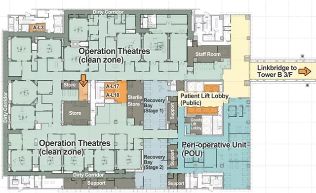 手術(shù)室使用過的設(shè)備儀器經(jīng)污物走廊運送至污物貨物電梯(A-L3)再運至地下室的中央消毒供應室,經(jīng)過消毒滅菌的物資通過潔物貨物電梯(A-L17 & L18)運送至手術(shù)室樓層存放并派發(fā)至相應手術(shù)室。A座三層的手術(shù)區(qū)包括住院手術(shù)室、急救手術(shù)室以及術(shù)前準備室,可直接到達B座三層的病房區(qū)(Arrow 1)。此外,一條內(nèi)部的無菌樓梯可直達四層的職員辦公室、更衣室等支持部門(Arrow 2)。