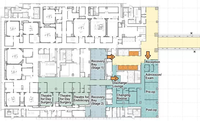 門診非住院患者通過主入口進入A座電梯到達術(shù)前診療臺(Arrow 1),手術(shù)結(jié)束后患者進入恢復區(qū)(第一階段),然后進入恢復區(qū)(第二階段),最后進入休息室(Arrow 2)。門診住院患者與門診非住院患者經(jīng)同樣路線到達術(shù)前診療臺(Arrow 1),不過在恢復區(qū)(第一階段)之后患者會通過廊橋到達B座病房區(qū)的相應病房(Arrow 3)。