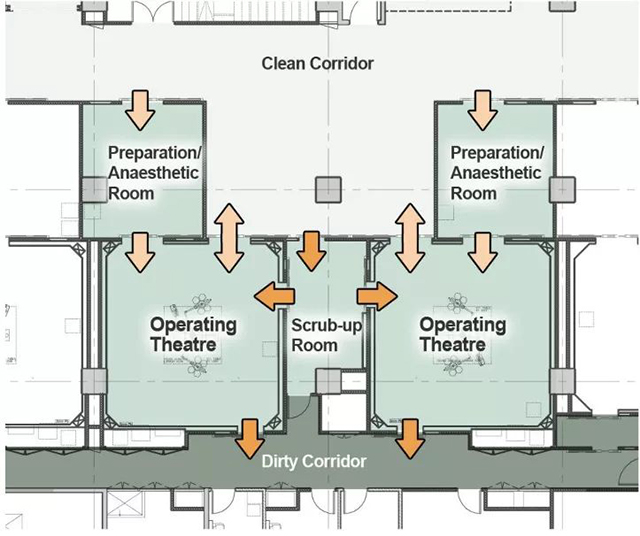 在設(shè)計手術(shù)室時,我們將清潔區(qū)域(Clean Area)及污染區(qū)域(Dirty Area)嚴格區(qū)分。通過設(shè)置室前潔凈走廊(Clean Corridor)、室后污物走廊(Dirty Corridor)、準備室(Preparation / Anesthetic Room)、清潔室(Scrub up Room)等,達到所有人員和物件的動線清晰且清潔區(qū)域與污染區(qū)域嚴格區(qū)分的效果,同時所有物流流向均為單向,避免二次感染。