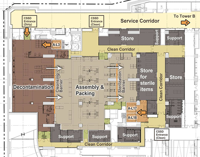 此外,我們的設(shè)計也會考慮污物分流運輸過程的路線:在A座和B座產(chǎn)生的污物會分別運送至地下室,再通過服務走廊(Service Corridor)運至中心消毒供應室。進行清潔后,再以不同的路線將潔物分流運輸至不同部門。