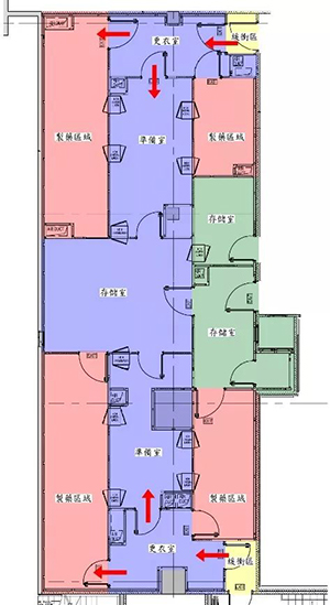 如上圖,工作人員從緩沖區(qū)(黃色)開啟第一扇門進入更衣室(紫色)后,只有第一扇門完全關(guān)閉方能進入準備室(紫色)或制藥區(qū)(紅色),以確保無塵室在任何時間皆保持為閉合系統(tǒng)。