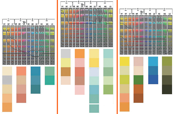 左:成人醫(yī)療環(huán)境色彩體系 中:兒童醫(yī)療環(huán)境色彩體系 右:老人醫(yī)療環(huán)境色彩體系