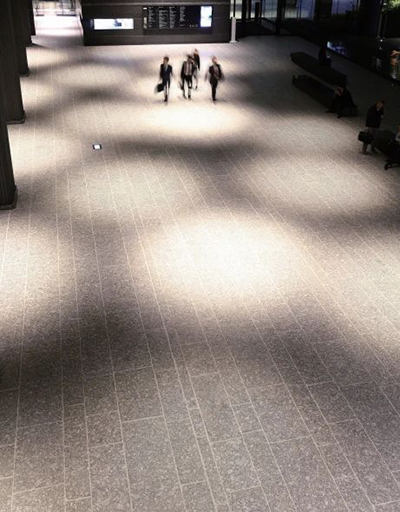 這種光在大樓內(nèi)部同樣被再現(xiàn)岀來,制造出了內(nèi)部與外部的一體感。 入口大廳和房頂?shù)奶旎ò迳嫌幸恍┛p隙,通過在其內(nèi)部裝上筒燈,可以模擬出從高高的樹梢 間隨機(jī)灑落下的光照。按照每個(gè)區(qū)域的場(chǎng)景設(shè)定,光照以每小時(shí)1照度的速度改變強(qiáng)度和位 置,從而讓人感覺到時(shí)光的流動(dòng)。