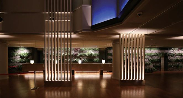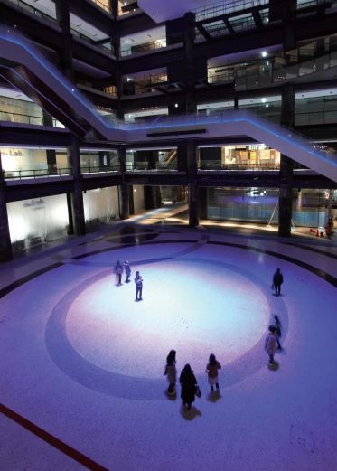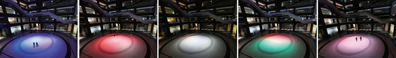 二次開發(fā)的中庭核心位置設(shè)置了吹拔空間,以“綠洲的水”為主題,用光來表現(xiàn)水的搖曳起伏。同時(shí)也安排了配合圣誕節(jié)等節(jié)日的燈光,并與外面的天氣相呼應(yīng),能夠在室內(nèi)用光模擬下雨等效果。