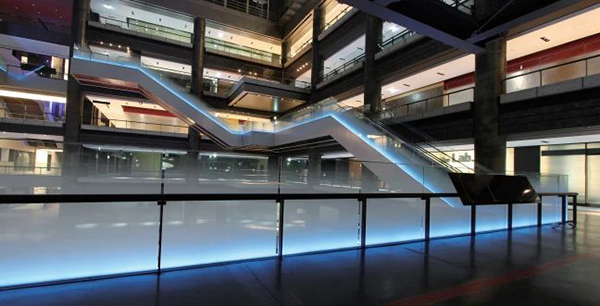 自動(dòng)扶梯的扶手中安置了可變色的LED,當(dāng)部分變?yōu)榧t色時(shí),可呈現(xiàn)出向上的動(dòng)態(tài)效果,使得建筑外立面上岀現(xiàn)仿佛巨龍升空的畫面。