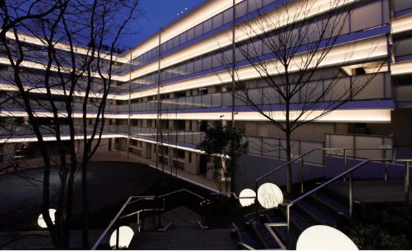 這棟辦公大樓被四季的樹木和綠色的庭院圍繞著。一樓公用的空間中,人們可以透過玻璃墻壁看到庭院。白天的庭院,陽光透過樹葉灑落下來。