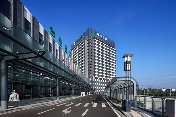 恩澤醫院北面入口處,南官河自東向西流過。通過河道橋梁進入醫院,車流被引導為上下兩層,下層通向急診和影像中心,上層則直達門診大廳。這一設計方案借鑒了機場航站樓的設計方式,使人員和車輛有序分流,有效避免了擁堵,幫助患者實現高效就醫。