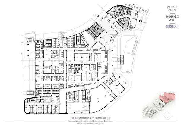 核心醫療區分為A、B兩棟,A棟的地上建筑面積為75533平方米。地上一層的主要功能為住院大廳、輸液大廳、放射科等;二至三層主要為檢驗中心、中心供應等醫技用房;四層是手術中心和日間病房;五層為設備層;六層至十六層為各病房護理單元,包括標準護理、特需護理和干部保健護理。