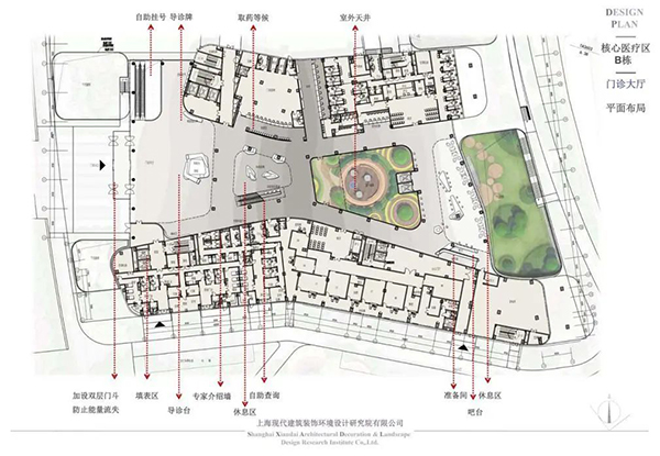 核心醫療區B棟的地上建筑面積為25474平方米,一層是門診大廳,二層至五層為門診單元、特需門診和行政辦公區。