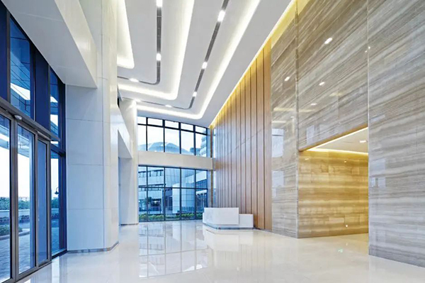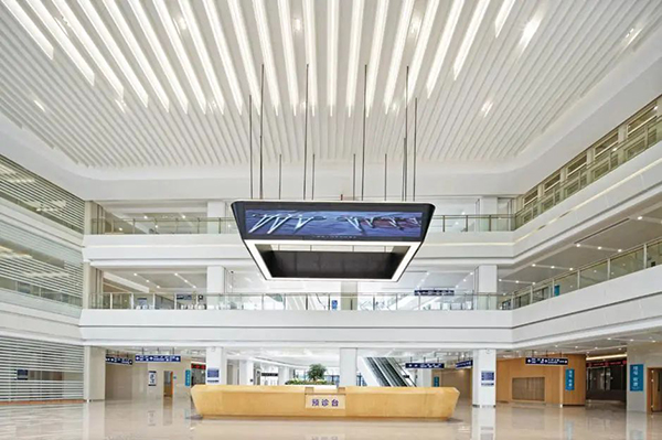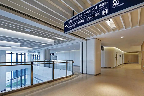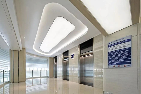 ▲ 門診樓電梯廳特意采用了透光軟膜天花,使空間燈光更為柔和