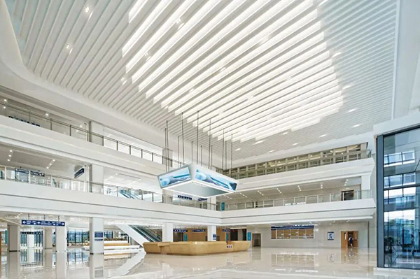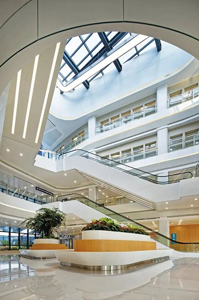 ▲ 門診大廳中庭四周的欄桿側板均采用與建筑外立面折線型幕墻元素相呼應的語言來表達,內外融合,具有濃郁的地域特色