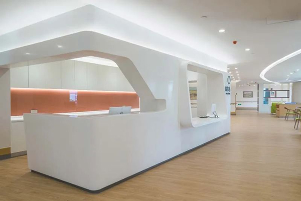 項目在設計中始終強調功能的實用與裝飾美的平衡,盡量讓自然光線進入人頻繁活動的區域里。在2~4層病房層靠近電梯及病房的位置,設計了集成式護士站,考慮到可以正常站立的患者和輪椅患者的不同需求,柜臺設計成了高低矮臺,同時也設計了輪椅的收納、患者休息等候等功能區域,簡潔柔和的造型區別于傳統護士站,更加美觀。