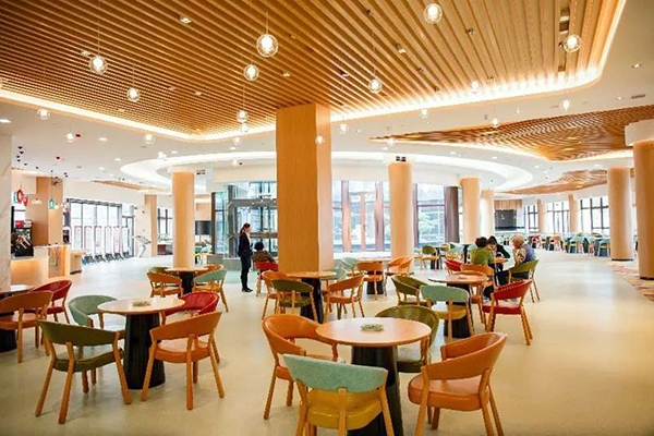 在大廳入口處的角落、康復訓練室的隔壁,有一個具有社交屬性的咖啡廳。木紋地面,舒適的木質座椅,大面積的玻璃幕墻,空間氛圍開敞明亮而生活化,等候的家屬、康復訓練的患者、社區的朋友都可以在這里聊天、閱讀、休息,彌漫在空氣中的咖啡香氣讓人感到輕松而溫暖。