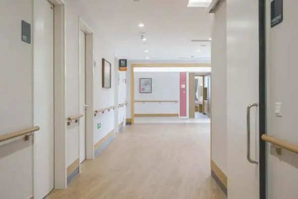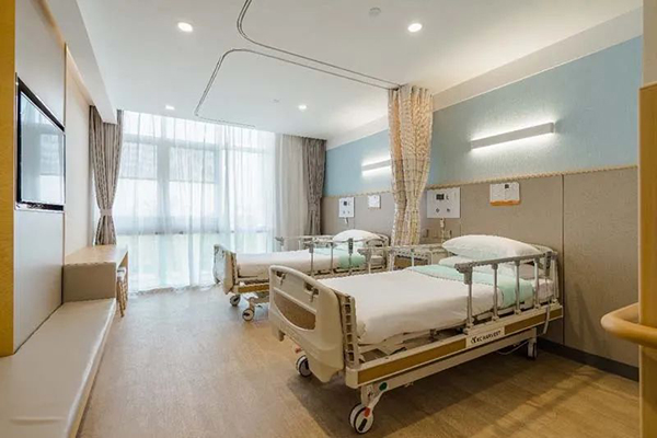病房空間的色調與使用的材料簡潔而雅致,天花材料用的是石膏板、地面選用木紋PVC地板、空間的基礎色調繼續延續木色,傳遞溫馨的心理感受。光環境設計采用間接照明搭配無眩光直接照明的方式,實現了充足的自然采光通風。