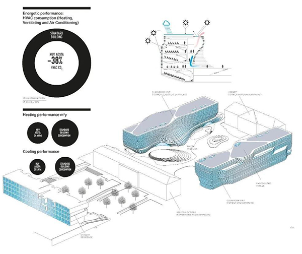 同時通過創新的校園體系結構,考慮一系列城市與校園功能的聯系,創建對環境和城市影響最小化的建筑,使其成為意大利首批零能源建筑和奧斯塔市現代城市化的地標。