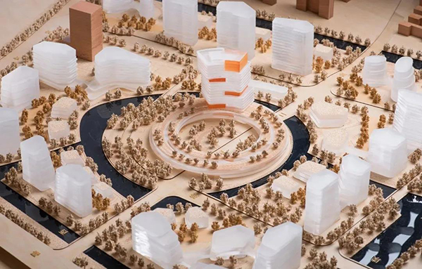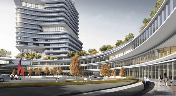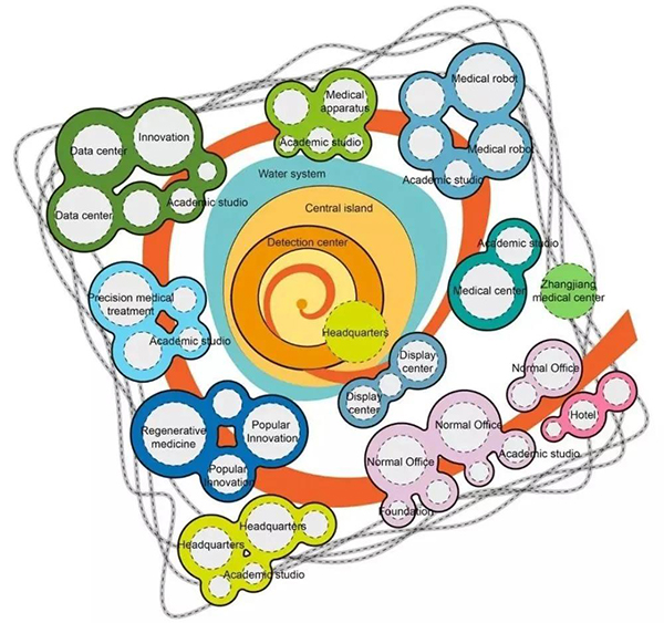 城市設計的靈感來自斐波那契螺旋,秩序與優雅并存的圖案象征著生命的自發與美妙,與智能醫療對生命科學的解釋不謀而合。螺旋的起點是場地的中心——南濱江總部大廈,螺旋的形態打破了方形基地的規整與嚴肅,由林蔭大道串聯不同地塊并容納豐富多彩的公共活動。