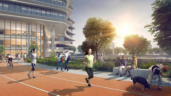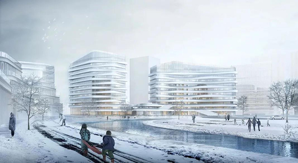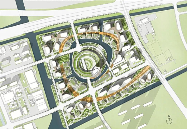基地被河流環抱,內部水系設計將它自然地分割為若干島嶼,其中基地中心的“動力島”最為奪目,環形的裙房層層交錯形成流動空間,并將這個螺旋的邏輯延續到裙房之上的塔樓,在形態與功能上都是集聚能量的活力中心,項目將于2018年底啟動動力島與漣漪島的施工。