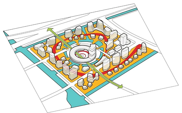 大量城市研究將城市活力問題歸因于街道過寬,卻忽視了其密度過低的本質。項目場地通過規劃道路與交大閔行校區相連,周邊整體呈現較低密度的開發模式。設計團隊深知成功的城市設計應當為不確定的城市活動提供豐富場所,而打開場地活力之門的鑰匙可能就是密度,即應當在周邊低密度的背景下創造一個無與倫比的集聚中心。