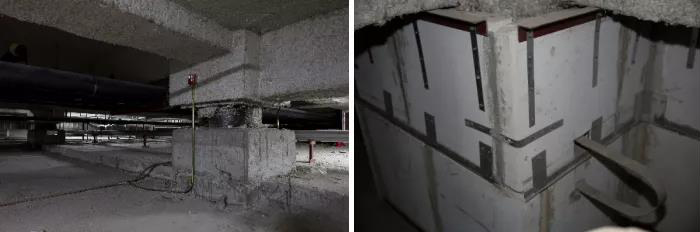 左圖:隔震墊照片 右圖:隔震層防火墻照片
