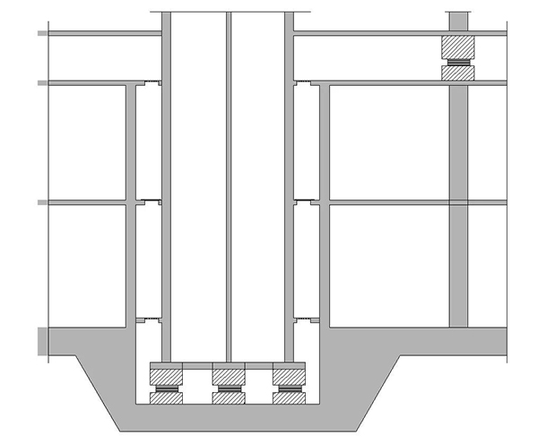 大樓在地下一層與首層之間設置了2.2米的隔震層。隔震層兼做管道夾層。大樓分為住院樓和門診樓兩個隔震單體,中間用鋼結構連廊相連。具體布置:住院樓選用直徑800、1000、1200的鉛芯橡膠支座,門診樓選用直徑700、800的鉛芯橡膠支座。