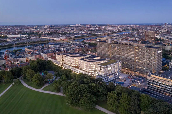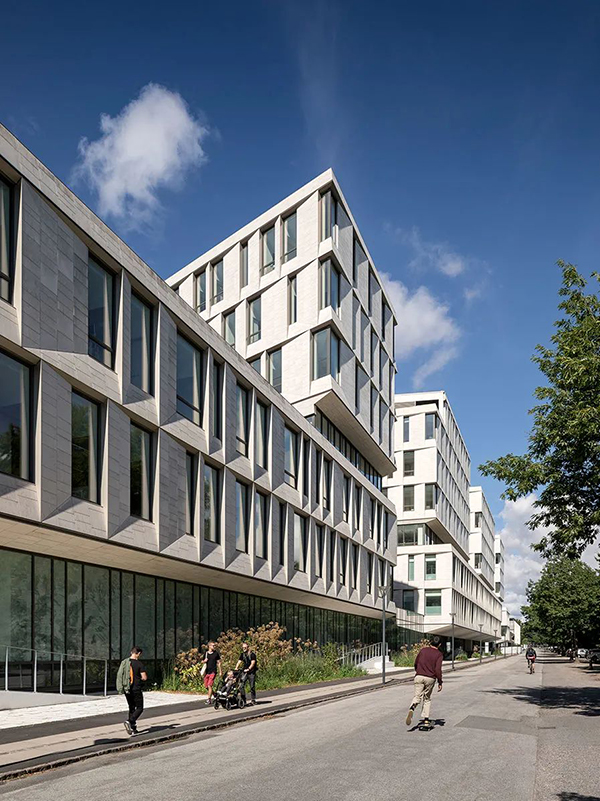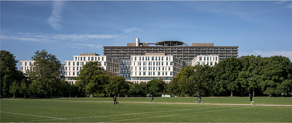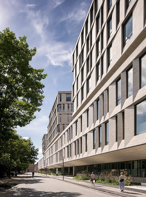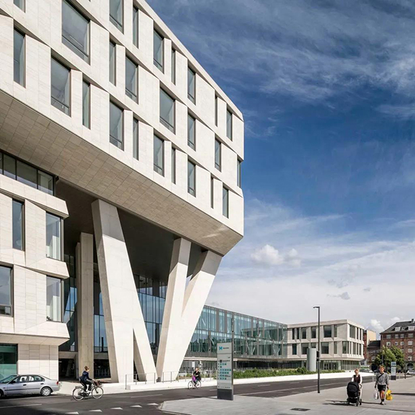 瑞格斯醫院位于哥本哈根市中心附近的公園和居民區。為了與周圍的城市環境融合,醫院北翼建筑從西北到東南逐漸縮小。這意味著該建筑物朝向現有醫院較高,而朝向馬路對面的經典哥本哈根式住宅區則較低。