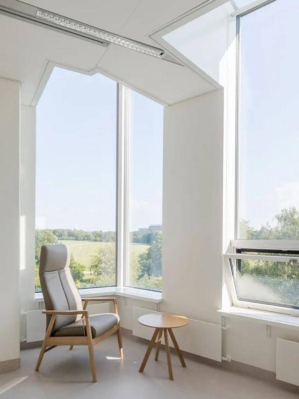 房間必須為患者治愈提供條件,因此建筑采光充足,房間明亮和開放。此外,建筑師還在聲學方面進行了廣泛的工作,以避免大空間造成大量噪聲。房間使用也很靈活,這意味著您可以靈活的變換房間。例如,如果門診訪問次數增加,您可以將病房臥室改為門診室。