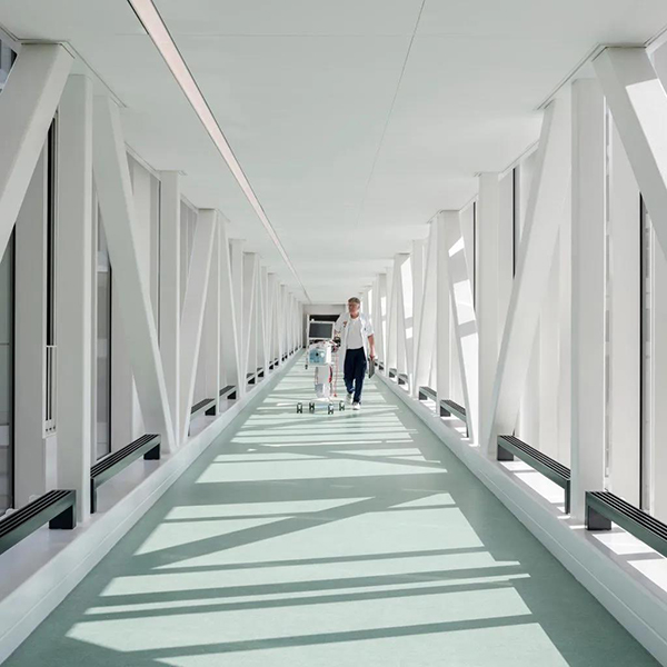 中央連接并與垂直方向分布相結合,可確保最佳的后勤物流,而V型結構可讓功能和單元之間距離更近,從而使醫院工作人員的步行距離最短。在臨床區域有一條主干道和“街道”,它允許工作人員快速從A移動到B,而不會干擾患者區域。在“街道”中,除其他設施外,還有住院患者及其親屬的休息室,休息室可滿足患者個人對自由裁量權,隱私和安寧的需求。