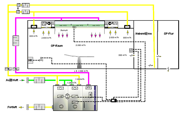我們可以假設一種方式,把現在的循環機組按照風的功能不同來進行分組,一臺循環機組就可以分成一臺“空調風”的循環機組和多臺的“凈化風”的循環機組組成。這樣“空調風”的循環機組的尺寸會變小,這樣對安裝就很方便,可以做成標準機型,打破現在的凈化空調必須是定制的壁壘,對手術室的安裝會大大縮短安裝周期和投資成本。