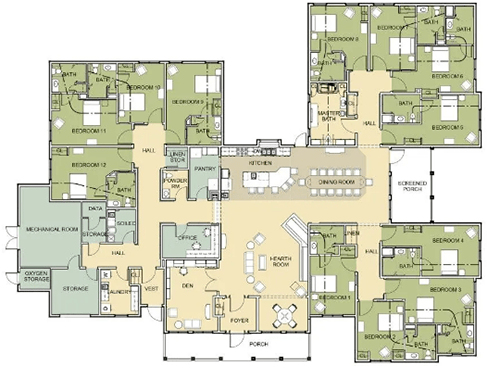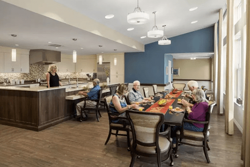 在大部分Green House社區中,10-12名老年居民住在一棟獨立別墅里,其空間布局、室內設計和裝飾與普通別墅無異。每一位居民都擁有獨立的臥室和配套衛浴,他們會共享開放式廚房、餐廳、起居室和書房。居民們沒有固定的起居時刻表,可以自由安排用餐、活動和休息時間。社區會鼓勵居民邀請家人、朋友、工作人員和老年居民們一起做飯、用餐,或者參與其他日常活動。