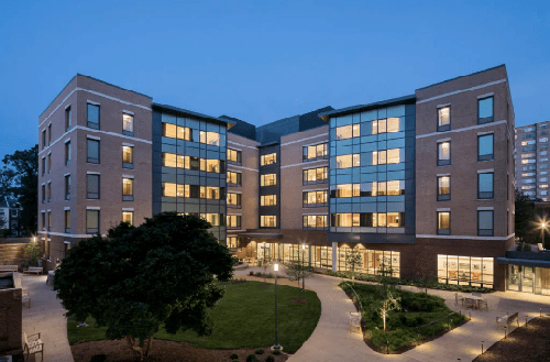 建筑設計事務所Perkins Eastman的近期作品,位于弗吉尼亞州的Goodwin House養老社區就是垂直組織的“小社區”,每一位居民都有單獨的臥室和衛浴,餐廳去中心化地分布在各個“小社區”中。