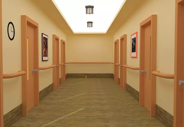 確定適宜的尺度規模,盡可能采用小規模的居住單元,減少同一空間內的人數,簡化生活環境,方便老人使用,在心理上避免形成負擔,同時方便護理人員及時為老人提供幫助。活動流線盡量簡單清晰,走廊長度不宜過長,盡量形成環形路,在老人漫無目的徘徊時也能方便回到自己的房間,防止老人因迷路產生焦躁心理。