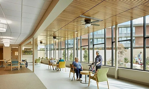 失智癥居民常常會尋找通往室外的門,想要“逃離”,當他們看到門,但卻無法打開時,往往會情緒激動、憤怒,因此建議將消防出口設置在走廊的一側而非走廊盡頭,這樣可以大大緩解這種尋找出口的沖動。