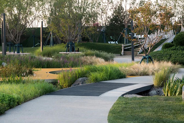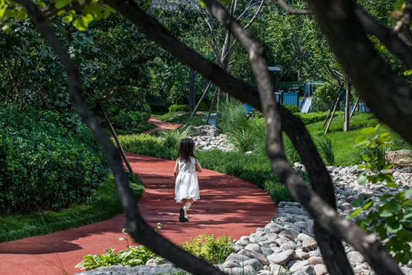 阿普貝思在融創(chuàng)系列居住區(qū)景觀設計中,將場地和道路與旱溪等海綿設施有機結合,景觀海綿一體化的設計使整個住區(qū)環(huán)境更加可持續(xù),帶給居民自然美好的生活體驗。