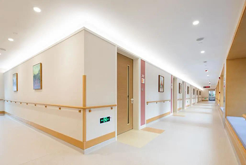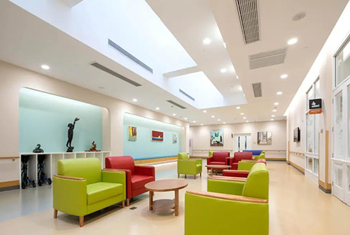 比如,在入口大廳與室外相連區域,因為室外自然光色溫較高,所以需處理好自然光與人工照明的平穩轉換,因此建議選用中間色溫(4000K)的暖白光來平衡自然光,讓自然光更好地過渡到室內,防止室內外明暗差距太大產生炫光;公共走廊的照度也應保持均衡,以免明暗的變化引起視覺上的不適。在燈具選擇和照明方式上,應優先采用間接照明+直接照明的方式,當采用下照式燈具時,應選擇防眩型燈具,并且該類燈具如果應用于醫院病房走廊區域,應盡量安排在天花一側,以免躺在移動病車上的患者直視光源時感到刺目。鏡面反射光也有可能引起眩光,因此空間材料的選擇應避免大面積選用過分明亮的裝飾面,光反射系數宜低于60%,地面反射系數宜為15%~35%。