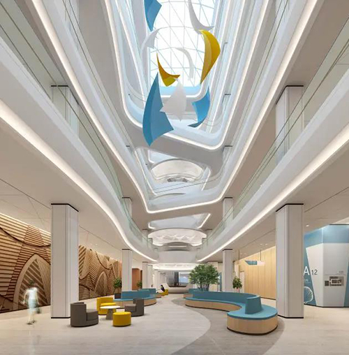 美國健康設計中心(The Center for Health Design)通過研究發現: 視覺藝術對人處于等待狀態時的焦躁行為有明顯的舒緩與降低的作用。將藝術引入人居環境的意義在于,無論是醫療空間還是辦公空間,藝術能給我們的生活帶來心靈的互動與積極向上的正能量。而光的藝術則主要通過圖像和色彩進行表現,形式上大致可分為情景照明(動態)和色彩照明(靜態)。