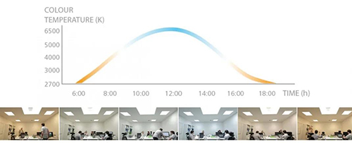 黑暗的房間會讓人產生恐懼,人需要通過自然光來感知外界變化,調節心理情緒,陽光對傷口愈合,對治療痤瘡、黃疸、佝僂病以及抗肺炎細菌等有很好的效果。辦公空間在有自然采光的環境下,也容易提高工作效率,當前就有一些辦公空間采用了根據時間段進行智能調光的系統,利用照明對生物節律的影響,提高人們的工作效率。在進行空間設計時,可以將需要自然采光和只需人工照明的空間進行取舍與劃分,讓自然光能照亮人們經常停留的空間。