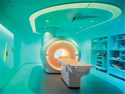 情景照明是一種以場景需求為中心,增加室內環境層次感,提升使用者光環境舒適度,提升環境氣氛,預制調光交互體驗的照明設計方案。而將其應用于醫療空間,在一些發達國家中也已經非常普遍,其目的就是為了打破患者心中醫院的固有印象,減輕他們的壓力,改善檢查治療效果。有些醫院甚至會綜合運用光、圖像色彩、聲音和嗅覺等手段,配合當地氣候,讓整體環境變得溫馨舒適,從而分散患者們的注意力,降低其恐懼心理,獲得一種擁有“私人空間”的感覺。這類情景照明在醫療空間中,一般應用于MRI核磁共振室、直線加速器、心導管介入、內鏡室等密閉型檢查治療空間中。